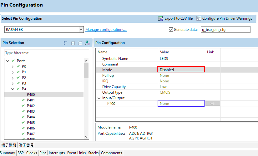 プロジェクトのコンフィギュレーションを開き、PinsタブからPort->P4->P400を選択、
