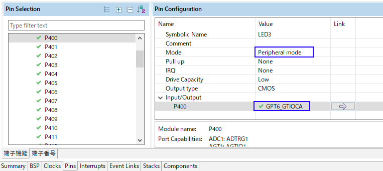P400ポートの設定内容を見ると、Modeが「Peripheral mode」、Input/Output->P400が「GPT6_GTIOCA」に変更されることが確認できる。