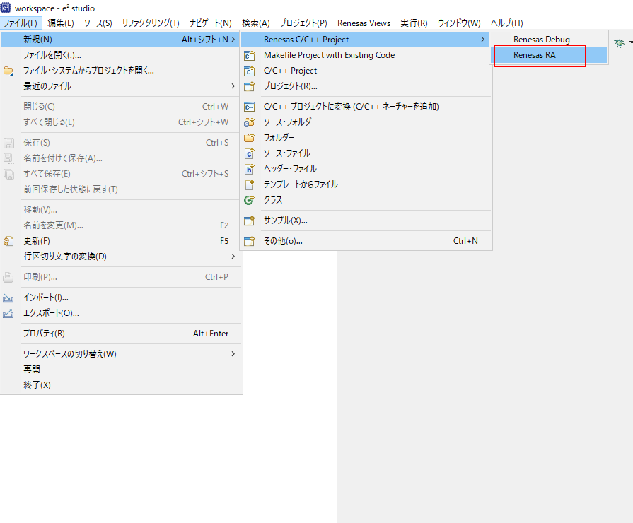 e2 stduioを起動し、メニューから「ファイル→新規→Renesas C/C++Project→ Renesas RA」を選択する。