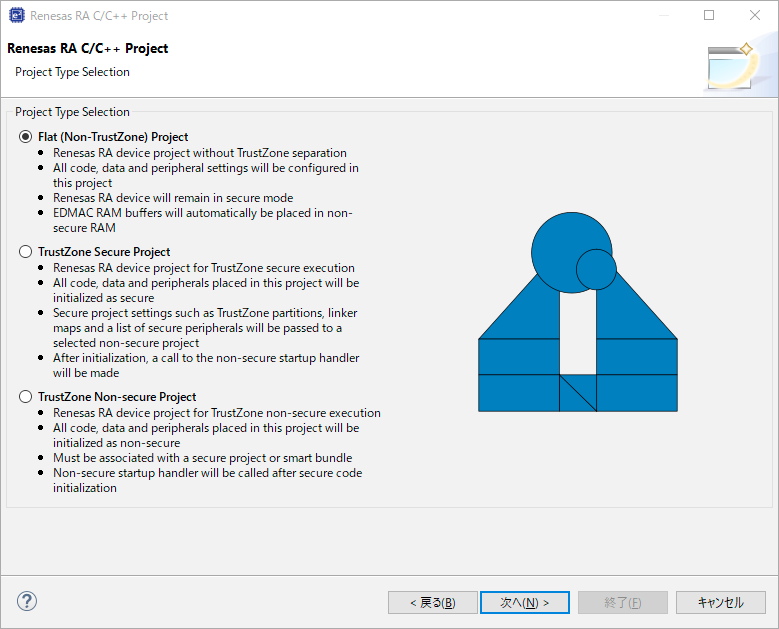 TrustZoneを使用有無についてのウィンドウが立ち上がる。使用しないため、「Flat(Non-TrustZone) Project」を選択して次へ進む。