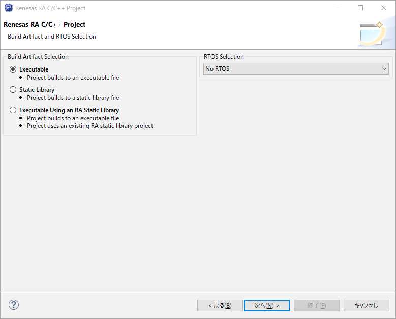 次にビルドの生成ファイルとRTOSの有無の問い合わせるウィンドウが立ち上がる。