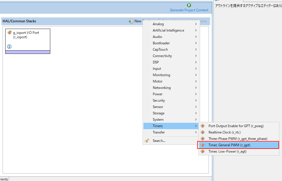上記の操作で汎用PWMタイマーを使用するためのr_gptスタックが追加される。