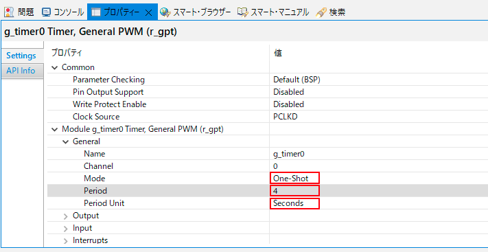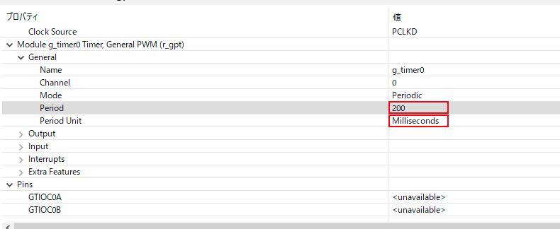 プロパティから「Module g_timer0 Timer General PWM(r_gpt)→General」を選択すると、タイマーのモード、またタイマーの周期が