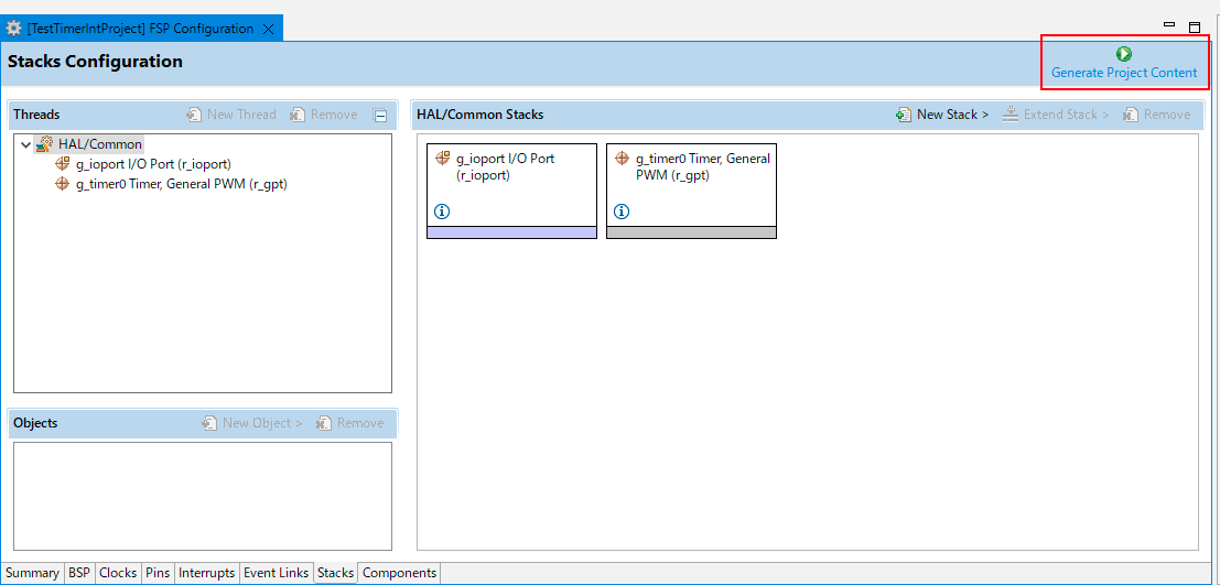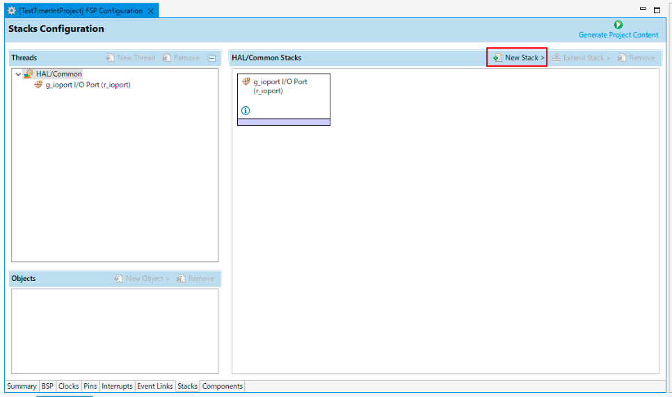新規のプロジェクト作成直前のConfigurationの画面は以下となる。r_ioportのスタックのみが存在する形となる。ここにGPTのスタックである
