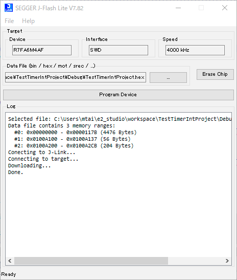 生成されたhexファイルをJ-Flash LiteでEK-RA6M4に書き込む。